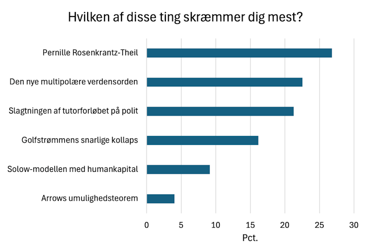 Selv blandt S-politterne svarer 21% at Rosenkrantz-Theil er mere skræmmende end både klimaforandringer og tredje verdenskrig. Mest bange for PRT er LA-politterne, iblandt hvem hun løber med 37% af stemmerne.