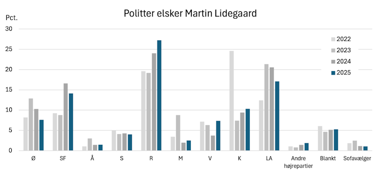 Ja, det er næppe Socialdemokratiet, der løber med titlen som årets politparti. Den ære går i stedet til Radikale Venstre, der fortsætter deres himmelflugt, bl.a. på bekostning af den tidligere politfavorit LA. Du har nok hørt om Daddy Vanopslagh, men på polit er der kun én daddy, og han hedder Lidegaard.