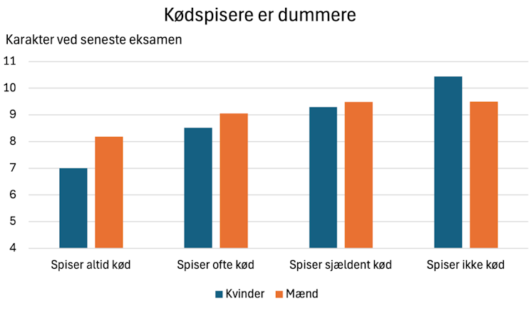 Men måske har den enlige vegetar fat i den lange ende – selv uagtet det der dyrevelfærdshejs. Vi har nemlig udført et studie af tilstrækkelig kvalitet til publikation i et større medicinsk tidsskrift, og vi finder, at det gør dig dummere at spise kød. Måske er det alligevel turen værd at gå ned og se om dagens blomkåls-risret er med eller uden karry.