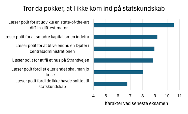 Meget kan man sige om polit, men vores undersøgelse viser, at det i sidste ende er lysten, der driver værket. Det er immervæk lettere at svinge sig op til at udlede steady state, hvis ens indre ild brænder for CGE-modeller. (Det viser sig dog, at man også kan komme ganske langt på en indre ild, der brænder for Karl Marx.) Hvis man derimod endte på polit lidt tilfældigt, kan det være sværere at få 12-tallet i hus.